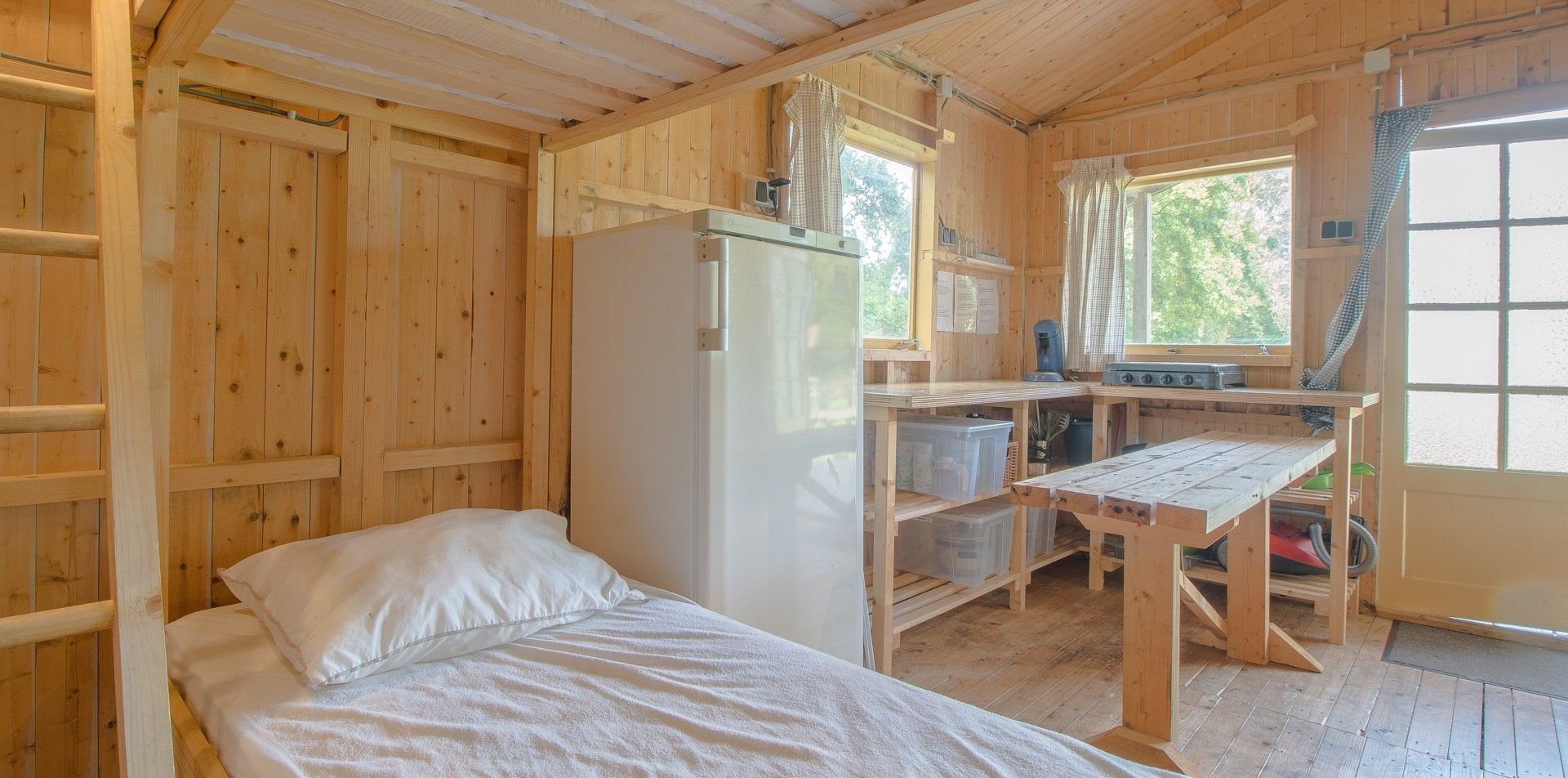 Een groot en gezellig groepsverblijf met maar liefst 14 slaapplaatsen verdeeld over stapelbedden. Met een grote eettafel, krukjes en houten banken, een hoge koelkast, een eenvoudig keukenblok met volledig servies, waterkoker en koffiezetapparaat, pannen en kooktoestel.